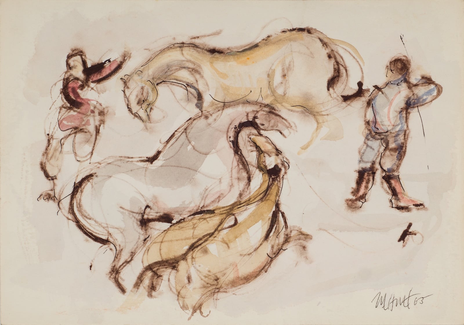 Wendy M. K. Shaw describes the series “Sen de Vur” (You Hit Him Too), as follows: “In subsequent years Güleryüz continued to emphasize gesture without giving up representation. He developed a mode of figural abstraction in which figures emerge from emotive lines and shades drawn quickly across the page. Despite the gestural immediacy of the drawings, the changing quality of line underscores his facility with the medium. This is readily apparent in the “You Hit Him Too” series of 1965. Here, straight, quickly drawn lines merge with meandering, ticked marks, producing tangles of cross-hatching that break off into loose threads and arbitrary coils. Layers of loose wash give body to the lines, enabling human and animal figures to emerge from the morass. Rather than giving way to flat forms, however, the contrast between the thick patches of cross-hatching and the thin washes with specks of paper showing through create a sense of deep shadow, enabling molded figures to emerge from the mess of lines. Like the games our mind plays in creating figures from the marks of steam on a shower door or cut wood or marble, these figures endure at the very limit of recognition.”
