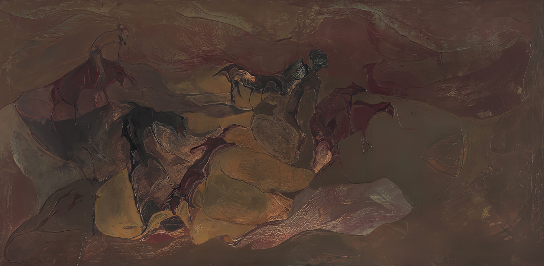 In 1963, when Mehmet Güleryüz returns to the Academy, he continues on at Cemal Tollu's studio. Since he realizes that the issues of expression in theater interest him, he turns to expressionist painting beyond abstract works. In 1963-64, Güleryüz establishes a connection with the figure and begins studying figures in dark tonalities. One of his references is trying to find the texture of Turkish embroidery motifs and Coptic weavings in painting. Using emerald greens, vermilion reds, thick paint, and a palette knife, he works on a series of paintings, creating texture with the spatula, varying the consistency of the paint through different strokes, and working with drawing-based compositions of interconnected human and animal figures. These are stylized surface paintings, but they do not reveal themselves much. At that time, Güleryüz thinks about African and cave paintings, the simplifications in primitive stylization; among his experiments, there are also nudes that do not reveal themselves in the darkness.