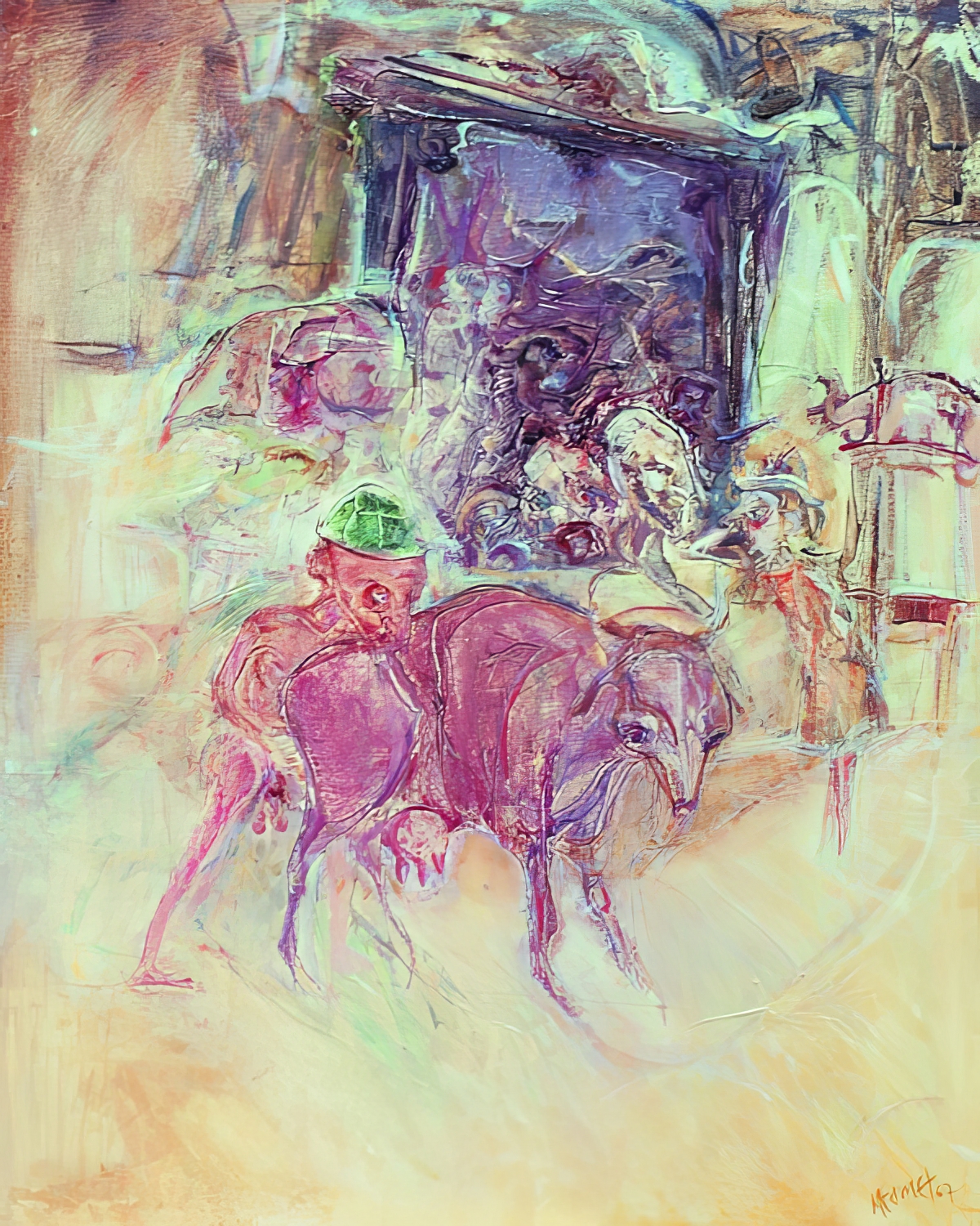 Through the Mirror became the first painting of that period. On the right side of the painting, there is a mirrored cabinet; the portraits visible in the mirror are conversing with the old prostitute standing in front of it; on the left, there is the atmosphere of the Kuledibi antique market and a naked man with a green cap who is engaged in a relationship with a cow.